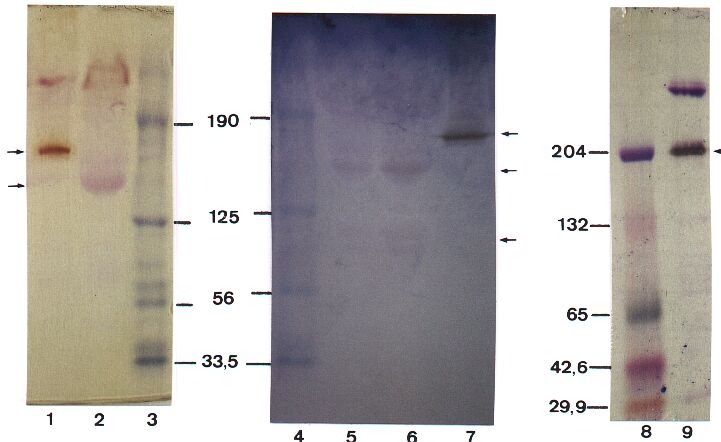 in Polyacrylamidgelen. Gele links u. rechts 3-10 %, Mitte 3-15 %;