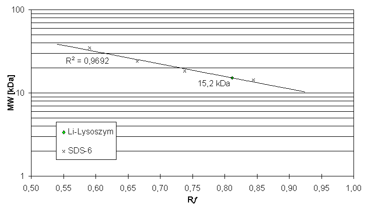 Abb. 40: Bestimmung des MW von L. forficatus-Lysozym. Eichgerade nach relativer Mobilität (R) des MW-Std. SDS-6 (ohne 45 u. 66 kDa) auf 15 % lMl-PAGE.