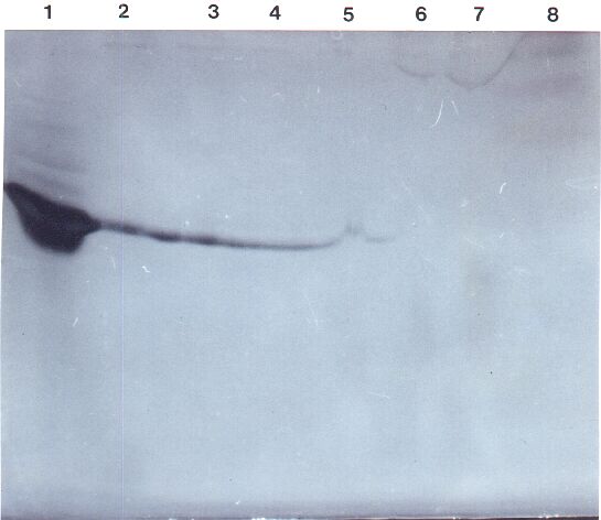 Abb. 41: Test auf Lysozymaktivität in Haemocyten und Plasma. 20 % lMl-Gel nach Elektrophorese u. Renaturierung. 1: 10 µl SDS-6; 2, 3, 4: 10, 5 u. 2 µl L.forficatus- Haemocytenlysat; 5, 6, 7: 2, 5, 10 µl Plasmalysat; 8: 10 µl SDS-K.