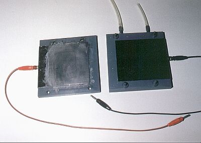 Als 'Semidry-Blot-Kammer' dient ein Eigenbau mit Edelstahlelektroden auf Kunststoffträgerplatten mit integrierter Wasserkühlung. Die Anode wird durch eine plangeschliffene Schicht "Leit-C nach Göcke" (Plano) gegen Elektroerosion geschützt (Abb. 5).